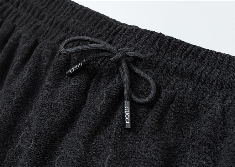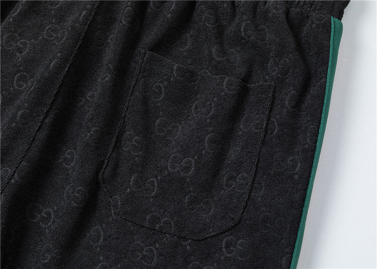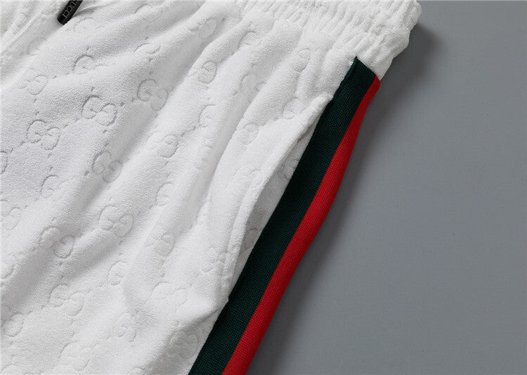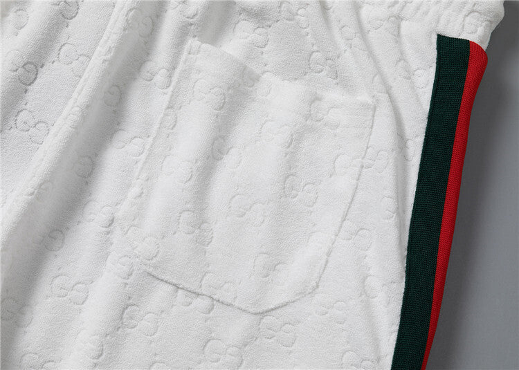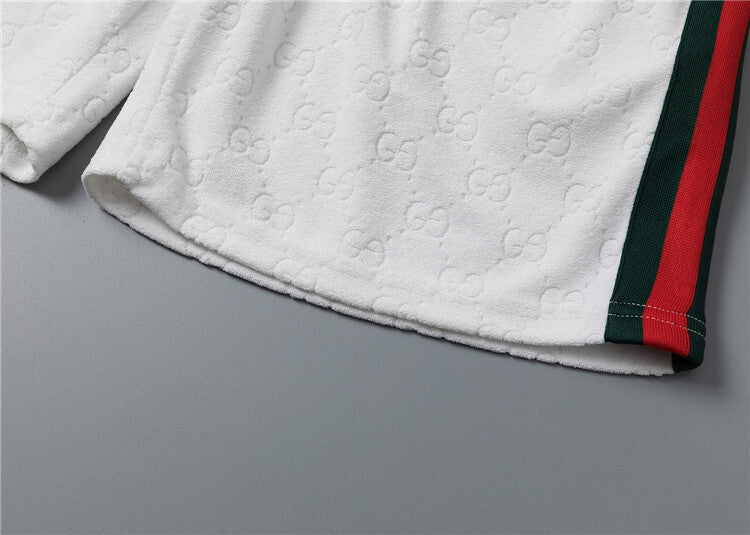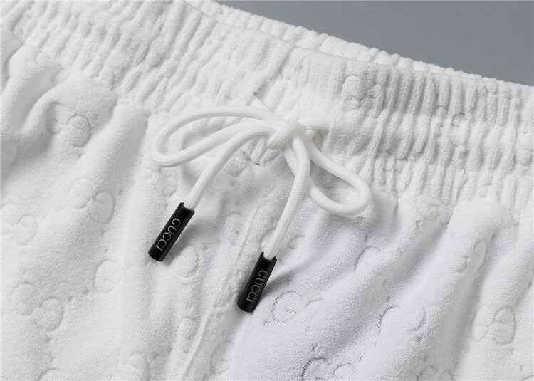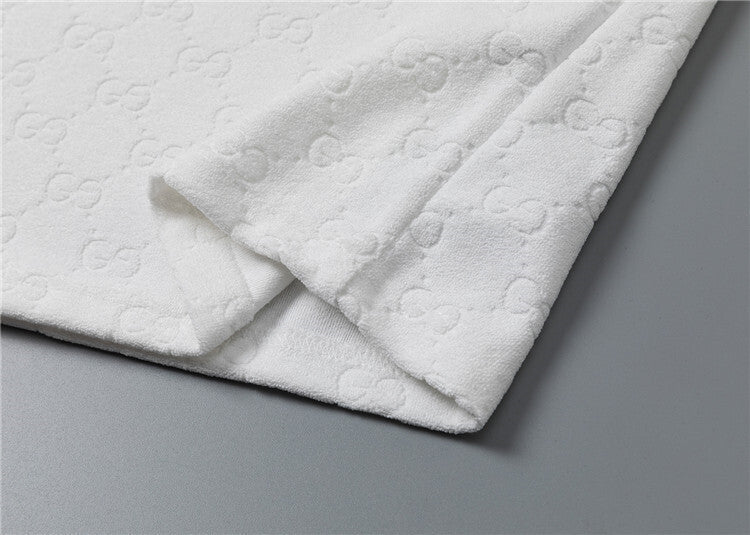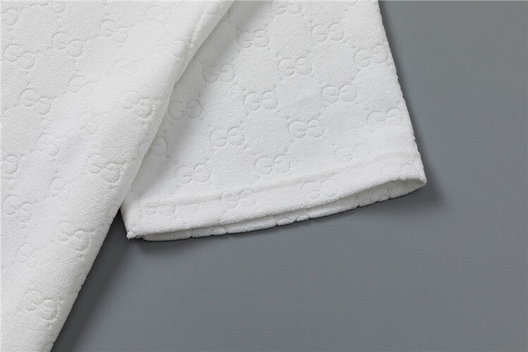Questo coordinato Gucci unisce comfort e stile iconico attraverso un morbido tessuto jacquard che riproduce il motivo GG in rilievo su tutta la superficie, disponibile in versione bianca o nera. Questo completo è pensato per chi desidera un look casual ma raffinato, capace di coniugare lusso e praticità in maniera perfetta.